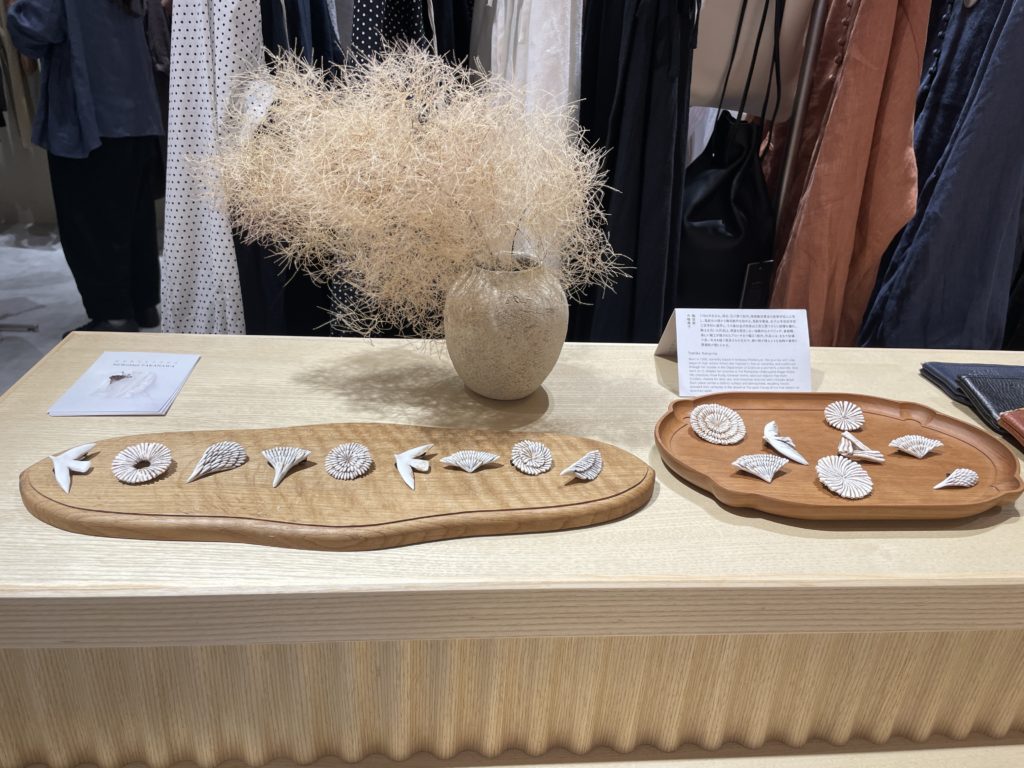 ペンダント照明やブラケット照明、レジバック壁面に鳥のディスプレイ等、同じ陶芸作家さんの作品を用い、フェミニンでポエティックな雰囲気を出すことができたように思います。
