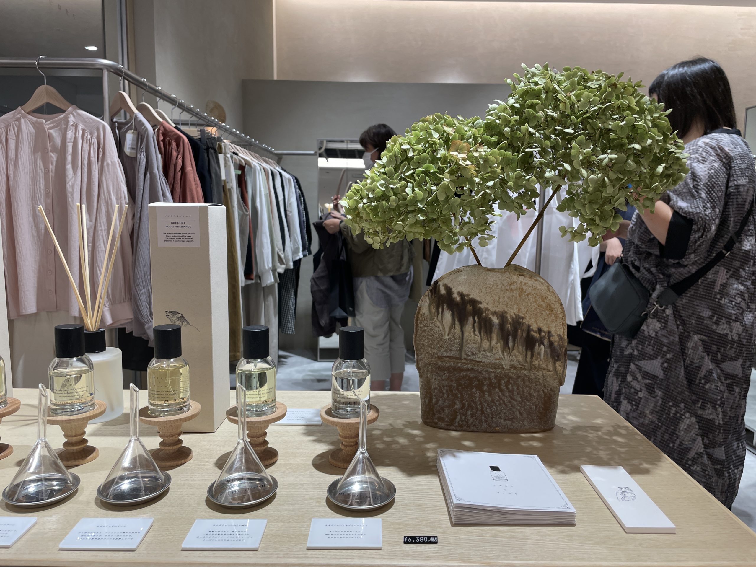 ペンダント照明やブラケット照明、レジバック壁面に鳥のディスプレイ等、同じ陶芸作家さんの作品を用い、フェミニンでポエティックな雰囲気を出すことができたように思います。