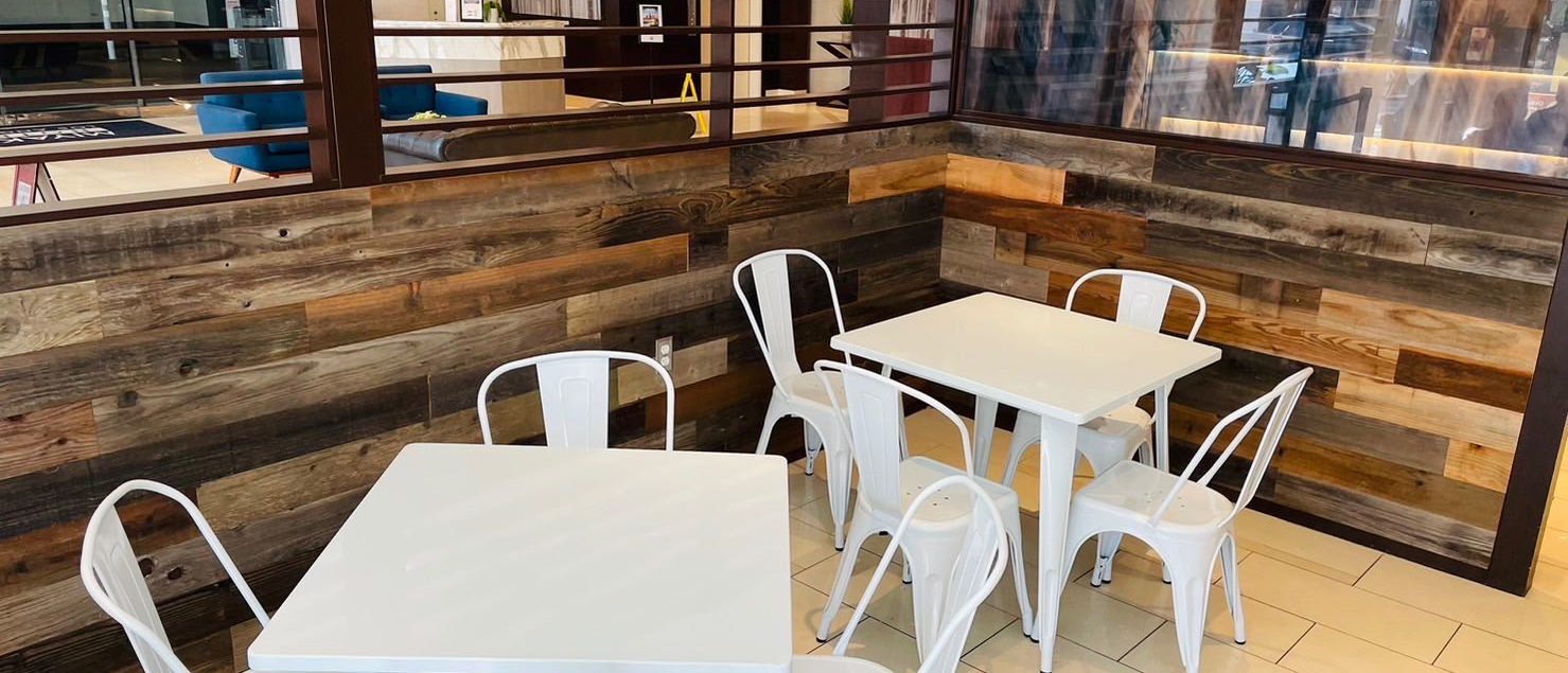 腰にレクイエムウッドを貼り、椅子、テーブルを並べられています。